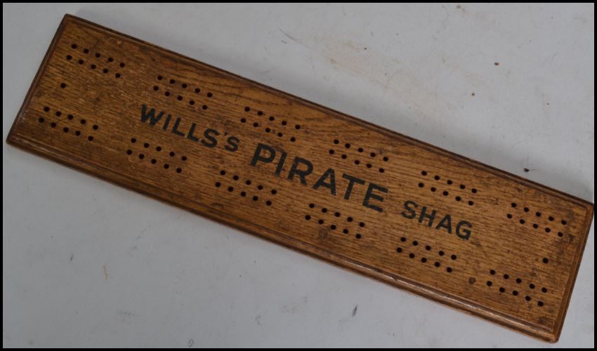 A rare and early 20th century cribbage board - advertising for Wills ' Pirate ' Shag, the board with central notation. Measures: 32cm wide.