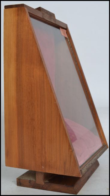 A vintage 20th century wooden cased point of sale shop counter advertising case for Cross pens, the glass front with notation under reading ' Mechanically Guaranteed For A Lifetime ' and notation ' Cross Fine Writing Instruments since 1846 ' the inner being velvet lined.