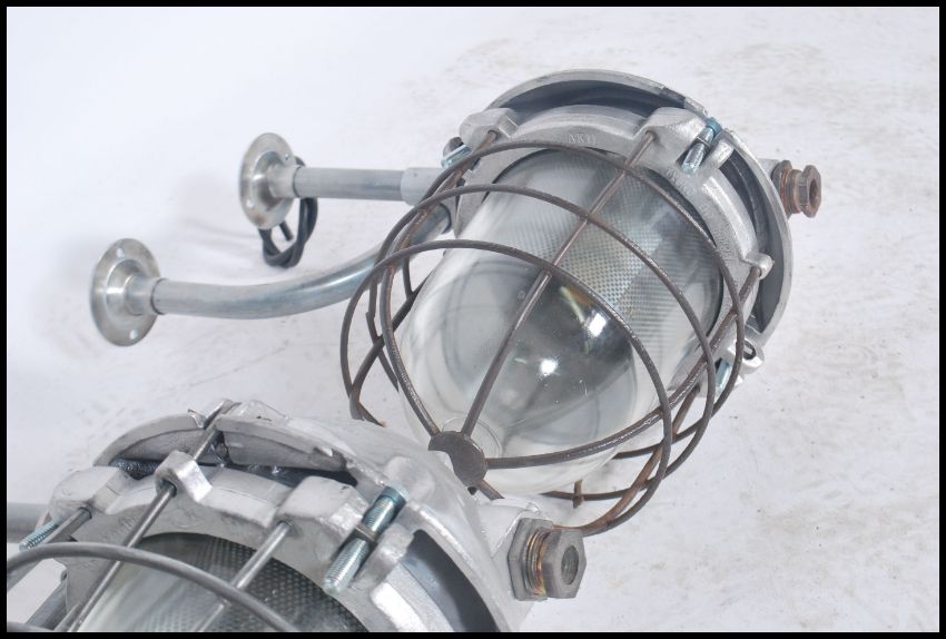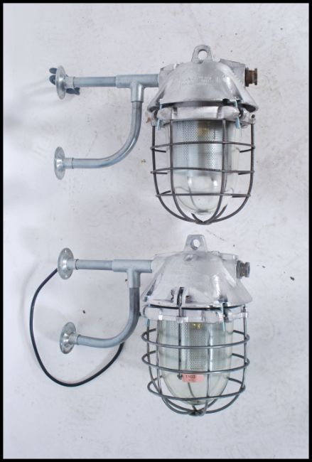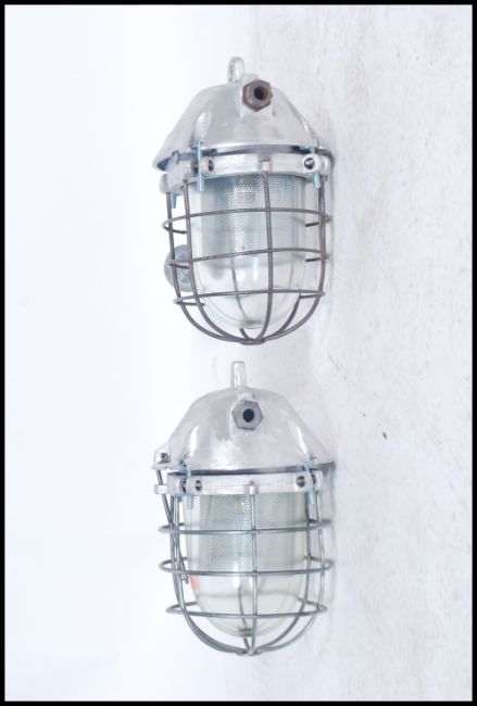 A pair of Industrial ' extreme condition ' heavy industrial bulkhead lights. Each with glass pendant shades being caged having polished metal bodies with wall bracket mounts. Polish origin with manufacturers notation to the tops. Further matching lights in lots 1103 / 942 / 968 33x38x20cm