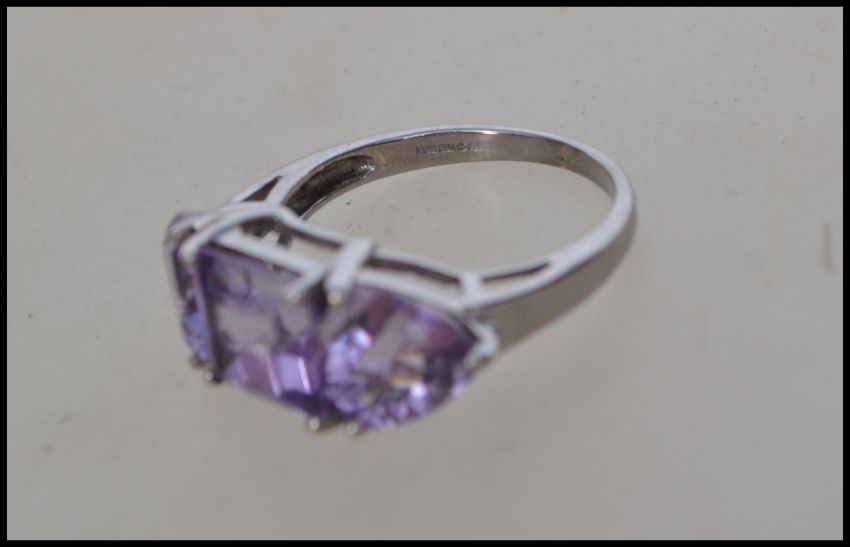 A hallmarked 9ct white gold ring set with purple stones. Hallmarked Birmingham.  Weight  4.1g.  Size N.