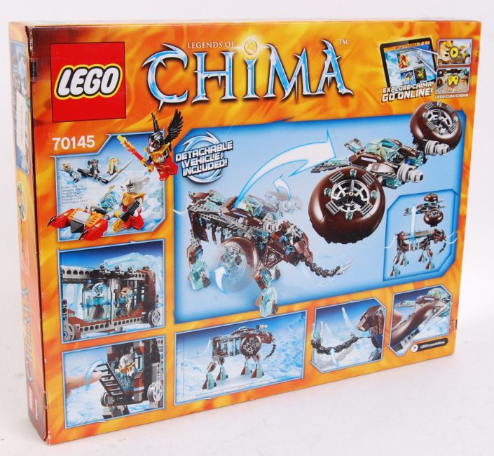 A Lego Chima series set 70145 Maula's Ice Mammoth Stomper. Factory sealed, as new, unused. Featuring a host of Chima minifigures, the main Mammoth Stomper also features a detachable vehicle.