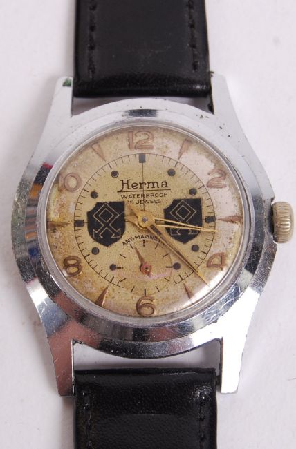 A 20th century 'fantasy piece' made wrist watch, with WWII German emblems to the dial. The watch being a Herma 15 Jewels watch. New straps.  NOTE: From a private collection of German militaria comprising of both genuine and replica items. Where possible we have stated ‘original’ or ‘replica’ but buyers are strictly reminded to satisfy themselves prior to bidding as to authenticity / condition irrespective of the description.