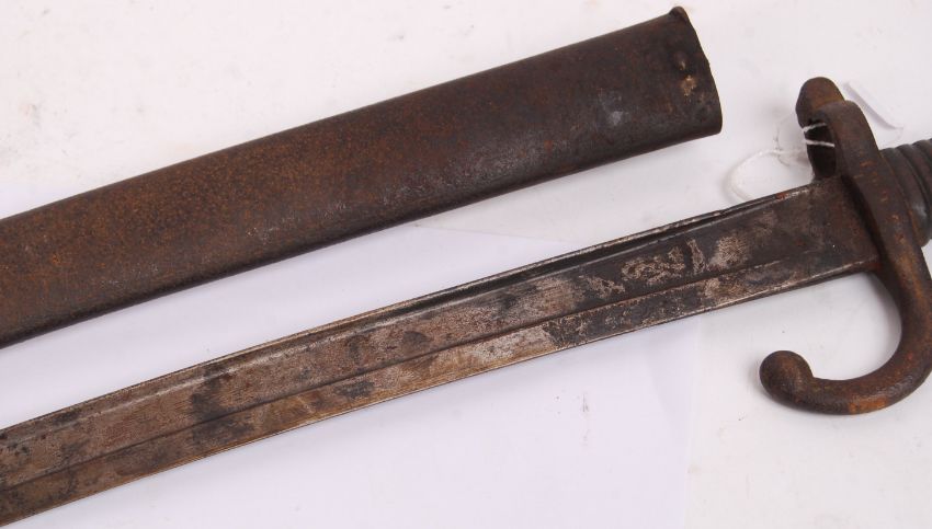 An original antique likely French artillery rifle bayonet along with its original scabbard. Measures approx 71cm long.