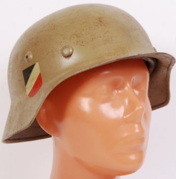 A WWII Second World War German Third Reich Nazi Afrika Korps M40 steel helmet. With palm tree swastika emblem to the left side and flag to the other. With liner and chin strap. Some parts appear reproduction, possibly restored.  NOTE: From a private collection of German militaria comprising of both genuine and replica items. Where possible we have stated ‘original’ or ‘replica’ but buyers are strictly reminded to satisfy themselves prior to bidding as to authenticity / condition irrespective of the description.