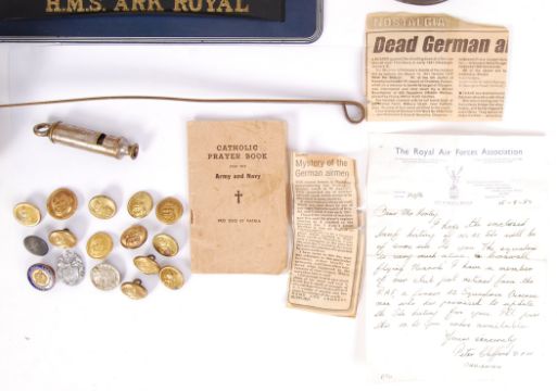 A collection of vintage British Armed Forces relating items to include; Army & Navy Prayer Book, 20th century ships copper lamp by Steam Drifters Stores Co Ltd, Lowestoft 1917 with bullseyes lens. Measures approx 34cm tall, Scout Master Whistle, HMS Ark Royal plaque, Royal Air Force tankard with newspaper clippings of a dead WWII German airman's identity who crashed in Bristol, along with letter & rum measure.