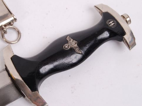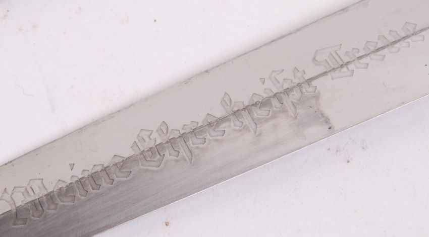 A WWII Second World War type German Third Reich Nazi SS Officers dress dagger. With eagle motif inset to handle, and etched motto to blade. SS rune to top. The blade marked RZM M7/36. With scabbard. 38cm long. NOTE: Buyers are reminded for the need to satisfy themselves as to accuracy of the item prior to bidding.