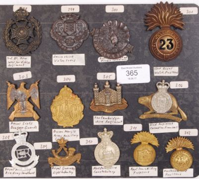 A collection of 16x assorted vintage military cap badges (WWI & WWII). To include Queen Mary's Regiment, Cambridgeshire Regiment, Lancashire Volunteers, Queens Own Worcestershire Regiment. All laid onto a presentation board.