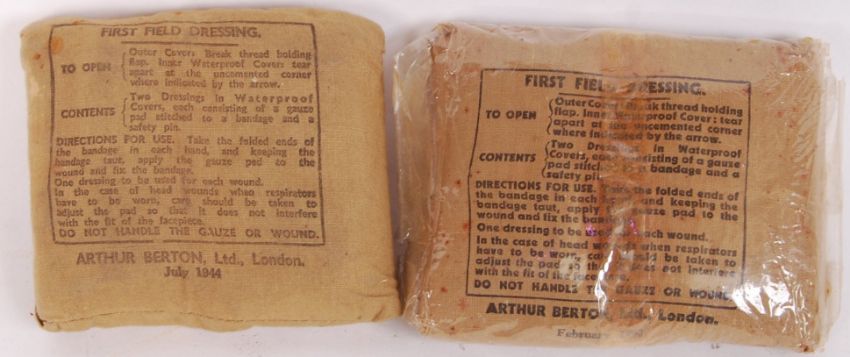 An original 1960's military First Aid box 'Outfit First Aid Large For AFV MT' to front with unused contents. inner mint. Also, to include 2x original Second World War WWII field bandages with separate tin box.