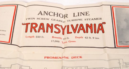 An original c1920's shipping interest Anchor Line deck plan for the  ' Transylvania ' steamer. Large pictorial of the ship to the top right, with various information in panels to the top. Transylvania was sunk by German U Boat U-56 in 1940. Measures approx; 59cm x 57cm. Ex 1920's Scottish travel agency.