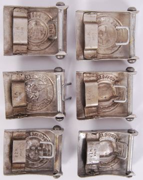 A collection of 6x reproduction WWII Second World War German military uniform belt buckles. To include SS, Infantry and others. Various designs.  NOTE: From a private collection of German militaria comprising of both genuine and replica items. Where possible we have stated ‘original’ or ‘replica’ but buyers are strictly reminded to satisfy themselves prior to bidding as to authenticity / condition irrespective of the description.