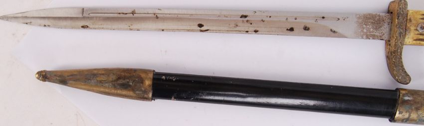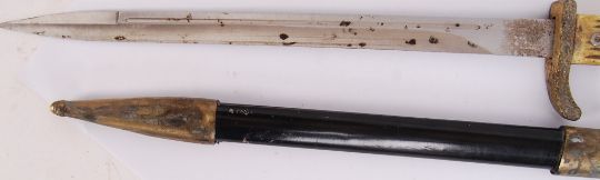 A German Police military parade dagger. Eagle headed grips, with police swastika lozenge to the handle. The blade marked for ACS. With scabbard. Approx 45cm long. Originality unknown.  NOTE: From a private collection of German militaria comprising of both genuine and replica items. Where possible we have stated ‘original’ or ‘replica’ but buyers are strictly reminded to satisfy themselves prior to bidding as to authenticity / condition irrespective of the description.