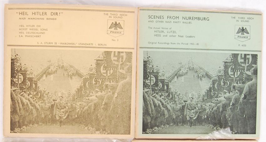 A collection of 4x vintage 20th century German Phonix Records 'The Third Reich In Sound' records to include; "Heil Hitler Dir!", Nazi Battle Songs No.1, Scenes From Nuremburg & Songs Of The Brownshirts No.2. All within their original card sleeves.