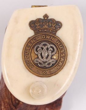An original post-WWI First World War c1921 7th Queen's Own Hussars Rams horn regimental table snuff mull. With regimental crest on top of hinged cover. Measures approx 27cm long.