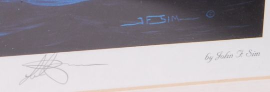 Titanic Interest; Voyage To A Legend limited edition print by John F Sim. No. 239 / 3000. Signed by the artist to the corner. Depicting RMS Titanic approaching the iceberg. Professionally framed and glazed. Size; 60cm x 90cm.