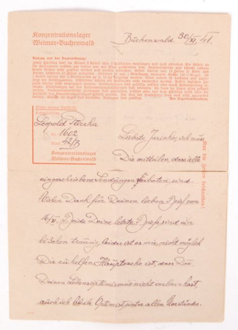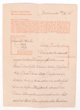 An original 1941 dated Third Reich Nazi German prisoner of war concentration camp letter from Buchenwald. Various official stamps to front. The folding letter handwritten with comments by a prisoner. Letters were used as a means of propaganda by the Germans to mask conditions and true activities at the camps.