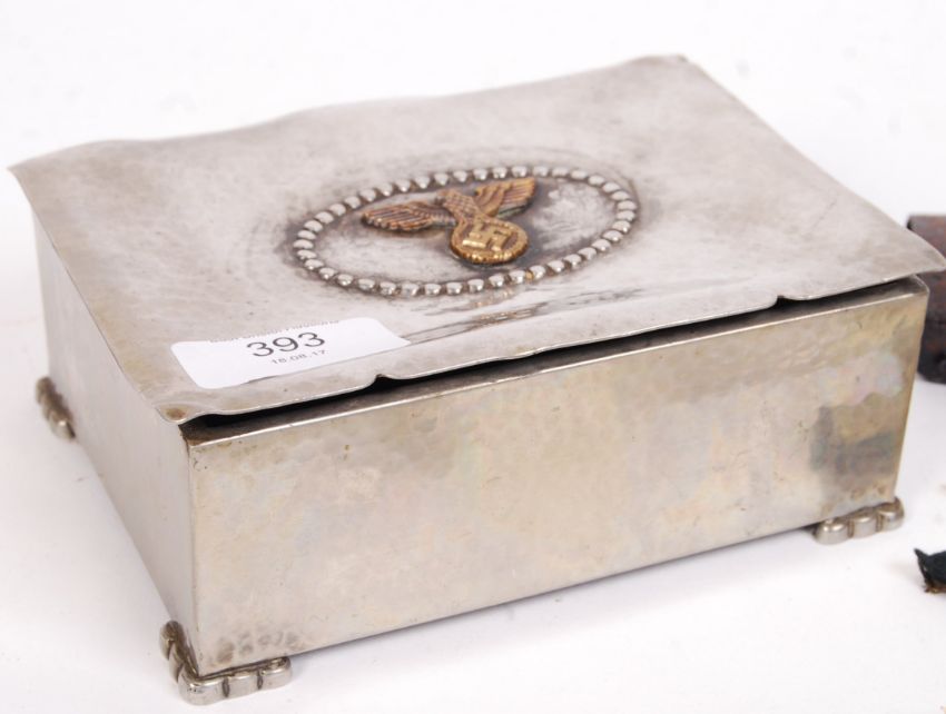 An interesting original collection of WWII Second World War German Third Reich / Nazi Party soldiers personal medals / effects. Comprising of; a collection of personal photographs, including several of a German regiment (snowball fighting, marching, and one of a conspirator getting hanged), an original (rusty) uniform belt buckle, the soldiers Iron Cross medal, War Merit Medal, West Wall Medal, tinnie, NSDAP members badge and other items. All houses within an original white metal silver plated German box with eagle / swastika motif to top. Rare.