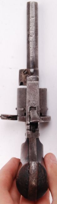 An antique late 19th / early 20th century Belgian pin fire single action six shot revolver pistol. Liege proof marks to top of cylinder. With walnut grips and folding trigger. Measures approx 17cm long.
