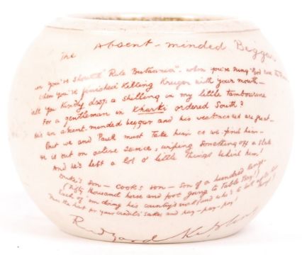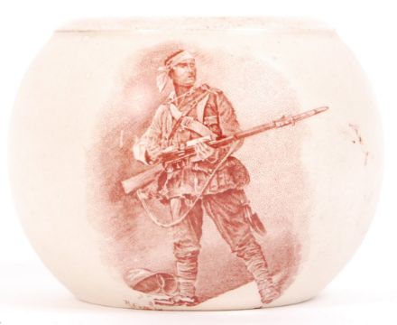An early 20th century Macintyre Burslem made 'The Absent Minded Beggar' military pictorial printed pot. Featuring a printed image of a soldier to the front, with 'The Absent Minded Beggar' poem by Rudyard Kipling to the reverse. Makers marks to base. Measures approx; 7cm tall.