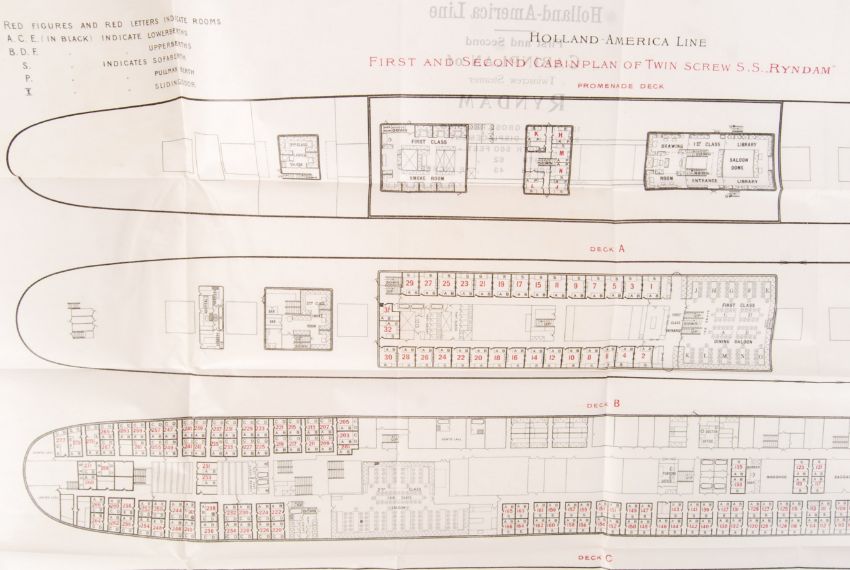 An early 20th century 1901 First & Second Class deck plan for the 12,527 ton Twinscrew Holland America Line ' SS Ryndam ' steamship. Cabin plan shows layout of passenger cabins & facilities from Promenade Deck to C Deck.   The Ryndam was know for surviving a German submarine laid mine in 1916 killing three crew members. It was scrapped in the Netherlands in April 1929.