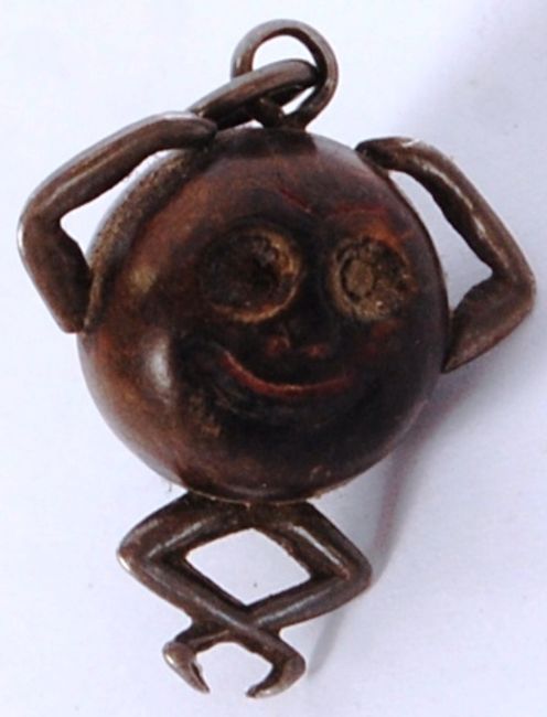 An original WWI First World War sweethearts "Touch Wud" military good luck charm. Hardwood construction, with white metal arms and legs. Measures approx 1cm tall.