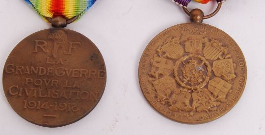 Two original WWI First World War Victory Medals, issued for Foreign allies. To include the France Victory Medal and a Belgian Victory Medal. Both with ribbons.