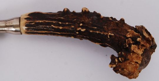 An unusual 20th century horn handled hunting/ bowie knife. No markings present. In original leather scabbard. 22cm long.