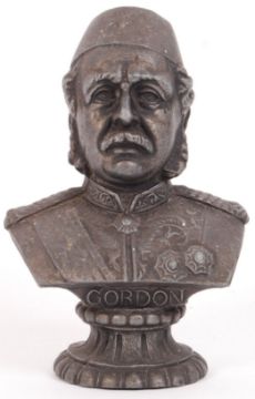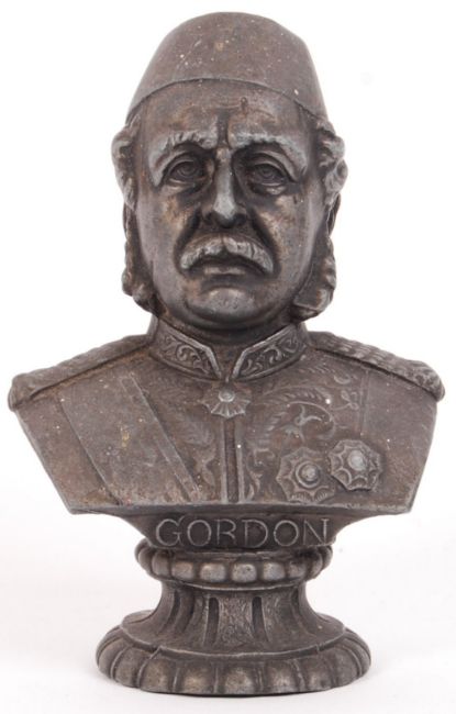 An antique likely 19th century white metal match strike, in the form of General Gordon. The bust depicting him with medals and marked ' Gordon ' to lower section. Measures approx; 13cm tall.