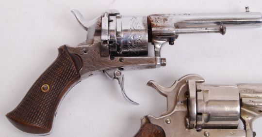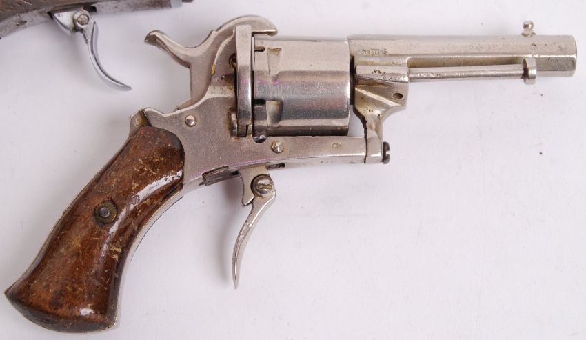 A near-pair (2) of late 19th century likely Belgian made six shot revolver pistols. One with engraved cylinder and barrel, with proof marks. The other unmarked. Both with wooden grips and folding triggers. Mechanisms appear AF.