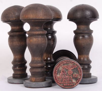 A collection of 5x reproduction WWII Second World War German Nazi 'Official' desk hand stamps. All wood in construction, with various metal stamps to the base.  NOTE: From a private collection of German militaria comprising of both genuine and replica items. Where possible we have stated ‘original’ or ‘replica’ but buyers are strictly reminded to satisfy themselves prior to bidding as to authenticity / condition irrespective of the description.