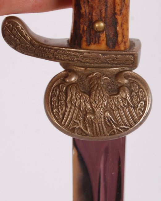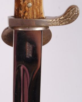 A 20th century German believed Police or Hunting dress sword. The blade marked Ewald Cleff, Solingen. Within its original scabbard. Horn handle, with eagle head motif to end. Measures; 59cm long approx.