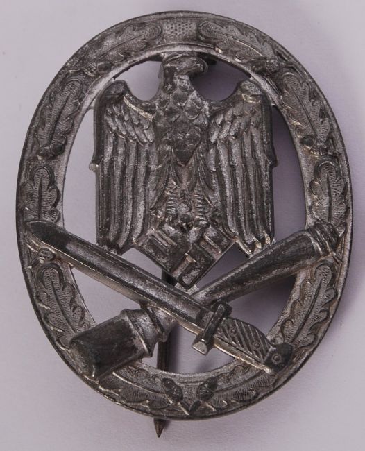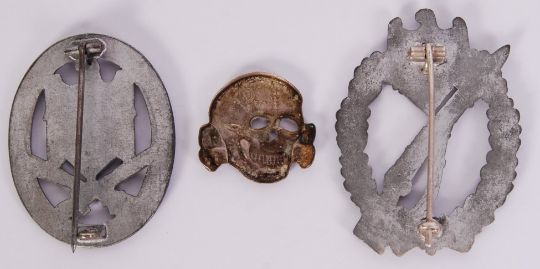 A collection of 3x WWII Second World War Nazi Third Reich badges to include; 2x reproduction General Assault & Infantry Assault badges & original second version SS- Totenkomp (Death Skull) hat pin badge with stamp to reverse.
