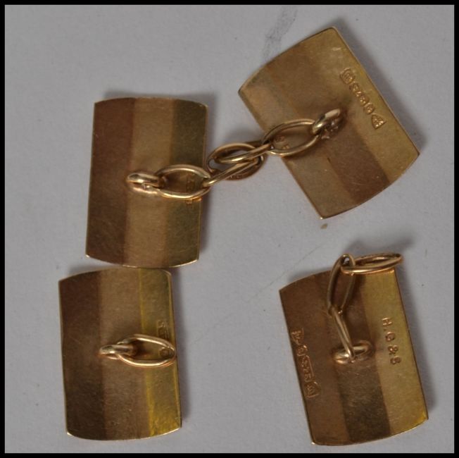 A pair of 9ct gold gentlemans cufflinks  having engine turned chevron patterns united by chains ( one chain af)  total weight 3.3g