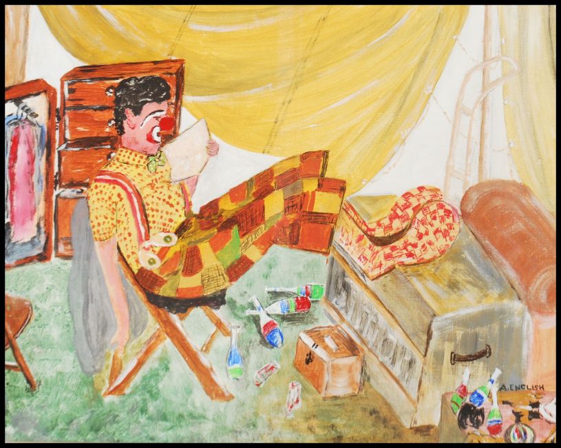 English, Arthur: (sitcom actor) oil and pastel mixed media painting of a clown entitled Between Showes comes with letter by Arthur and typed note. Framed and Glazed.