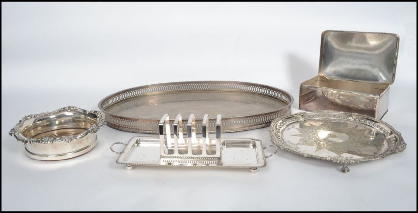 A collection of silver plated items to include a large table top cigarette box, silver plated gallery edge salver, small salver by Walker & Hall, toast rack by Kemp Bros, wine bottle coaster