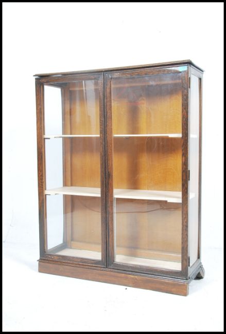 A vintage 20th century  oak china display cabinet having a pair of glazed doors with a series of shelves to the inner raised on shaped legs. Measures 120cm x 91cm x 30cm