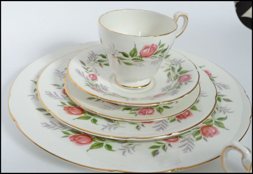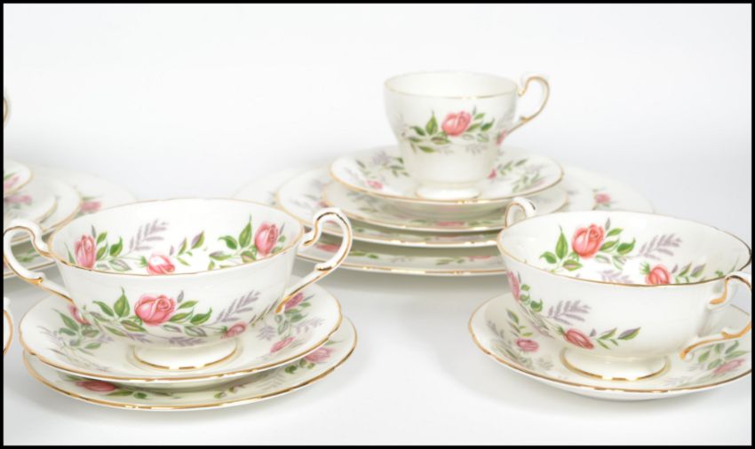 A vintage 20th century chintzy pattern part tea, soup and dinner service by Paragon in the fragrance pattern consisting of cups, saucers, soup bowls, dinner plates etc. Stamped to base.