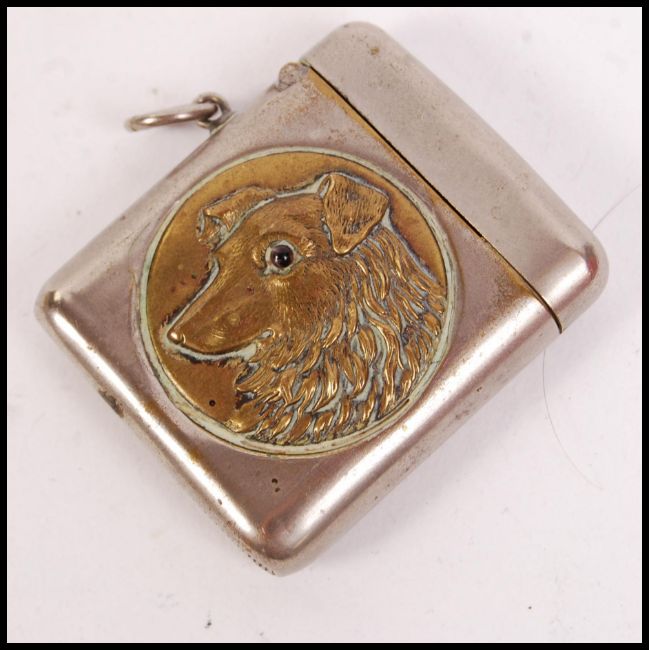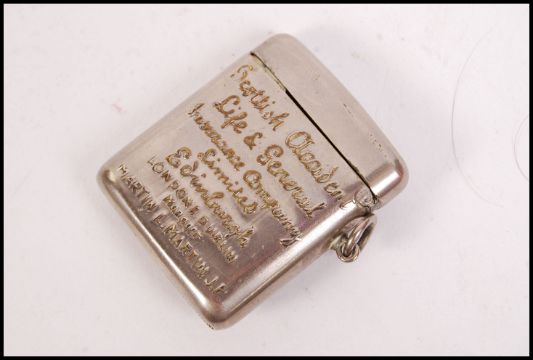 A vintage silver white metal vesta case having a circular gilt medallion with working dog with glass eye and notation for Scottish Accident Life & General Insurance Company Ltd Edinburgh London and Dublin.