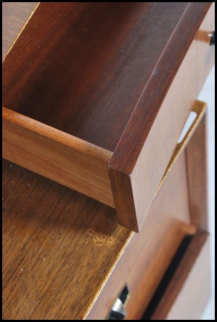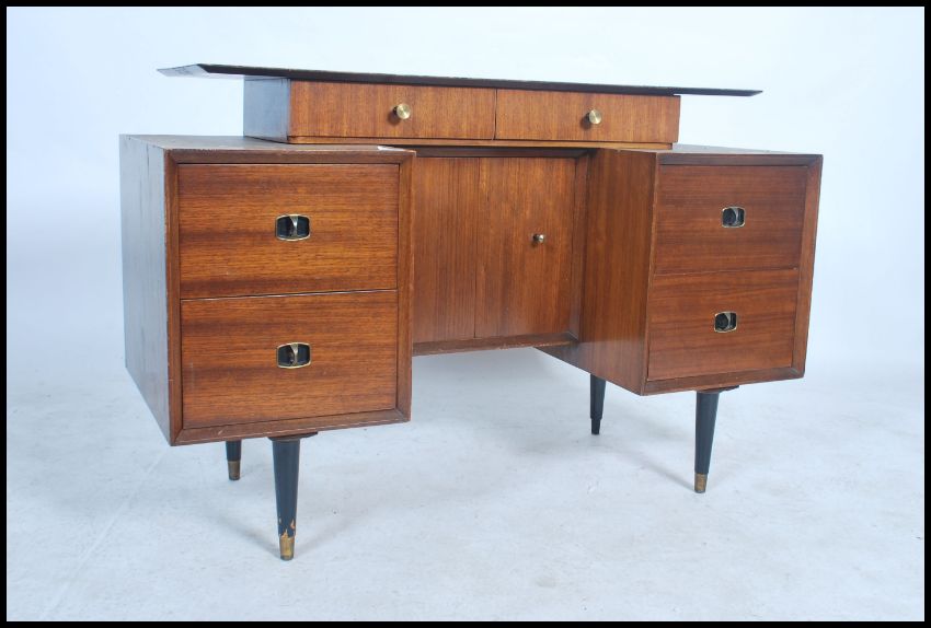 A 1970's retro teak wood G-Plan type writing table desk having floating pedestal drawers with shaped top above