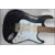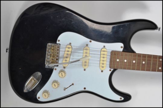A vintage six sting electric guitar by Encore Coaster having a stratocaster type body in black with white pick guard.