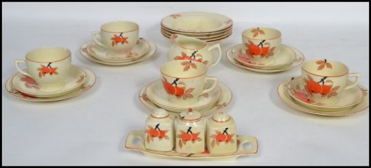 Local interest a part Bristol hand painted part tea and dessert service in the ' Delysia ' pattern, the service decorated with hand painted oranges. Stamped to the base Bristol Poutney & Co Ltd Amberone ' Delysia '
