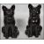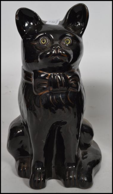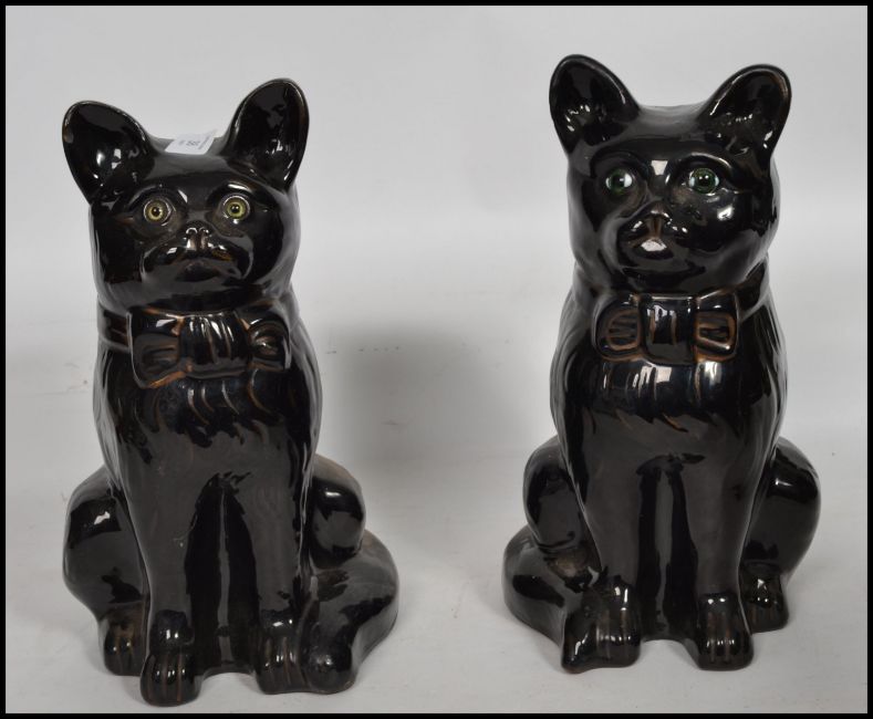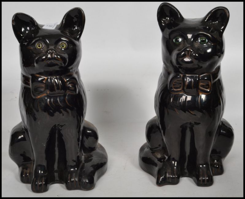 A pair of 19th century Victorian ceramic Jackfield Staffordshire earthenware cat figurines having red glass eyes with  bows to front.