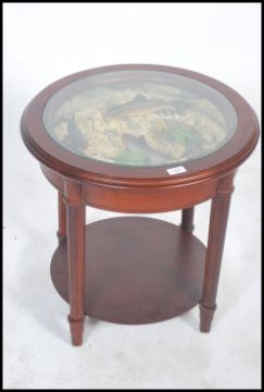 A 20th century circular Bijouterie Cabinet having a montage display to the centre of a river bed featuring British Trout, Rainbow, Golden and Brown Trout's on display.