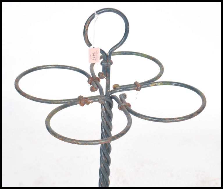 A unusual early 20th century vintage metal stick / umbrella stand having a central twist column with four hooped sections and a handle atop being ebonised.