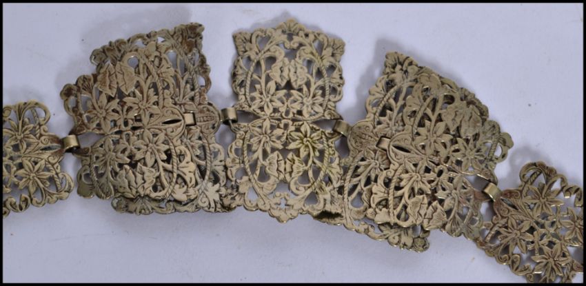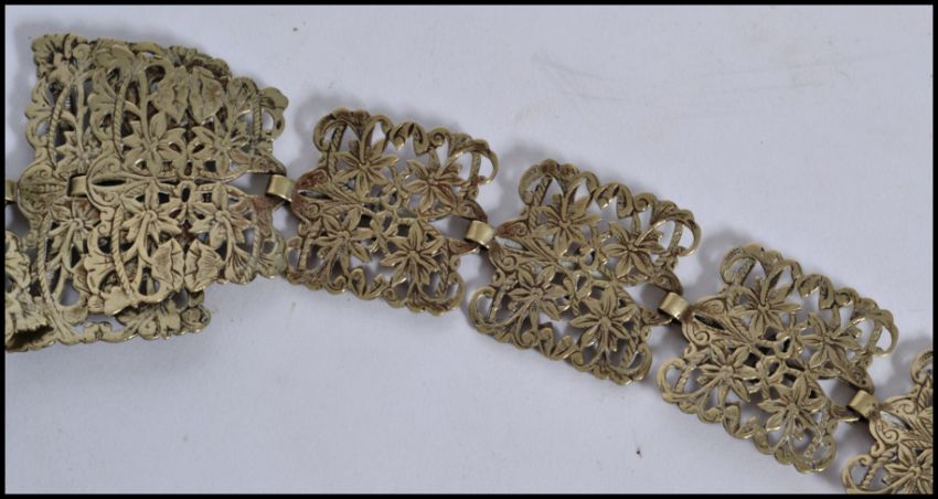 A 20th century silver plated nurses belt having a pierced rococo design with adjustable spring each piece stamped EPNS.