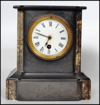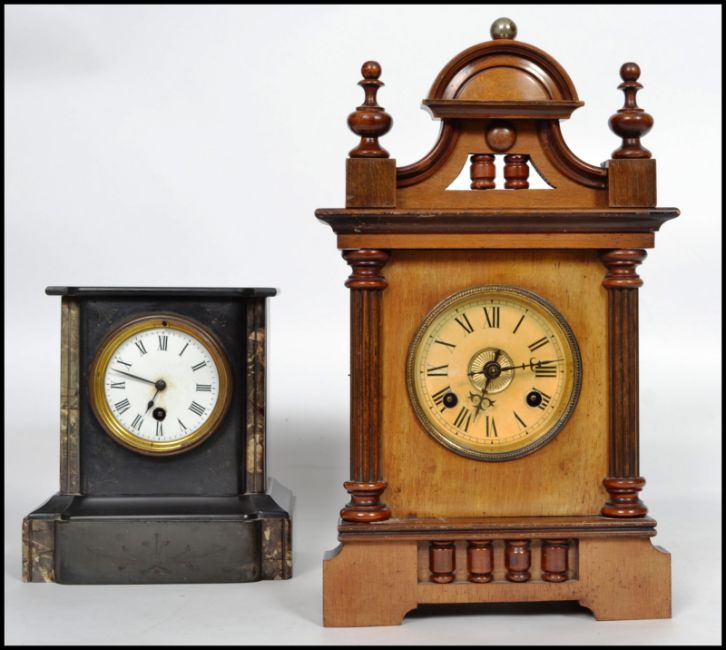 A late 19th century marble and slate mantel clock together with an eight day mantel clock set within a wooden case. Measures 47cm tall.