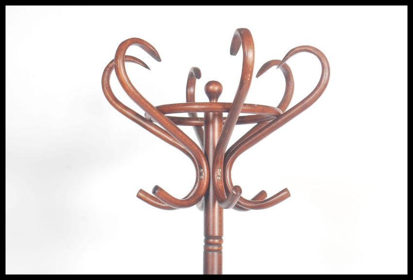 A 20th century Thonet style bentwood hatstand having shaped hooks on turned column with splayed feet.