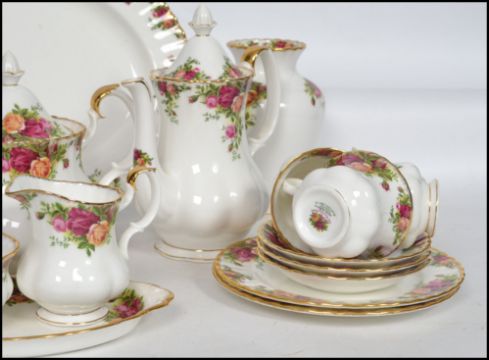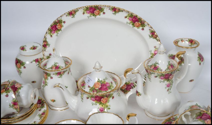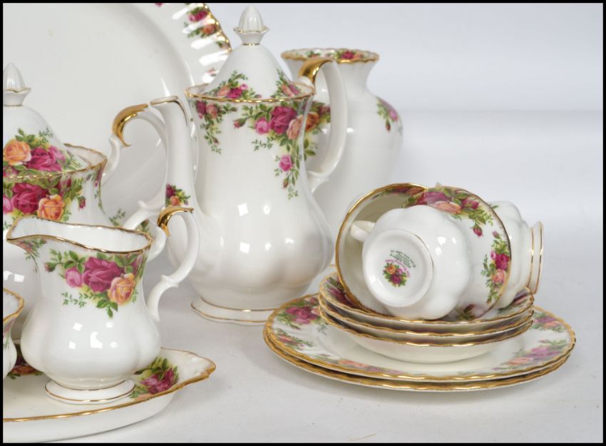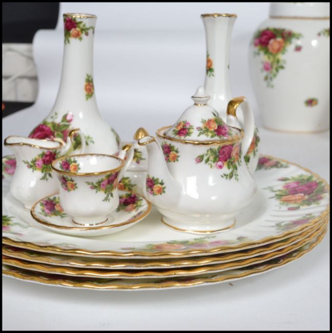 A vintage 20th century Royal Albert Old Country Roses part tea and dinner service consisting of large serving platter, teapot, water pot, 6 cups and saucers, side plates, dinner plates, vases, miniatures, ginger jar, etc. Please see images.