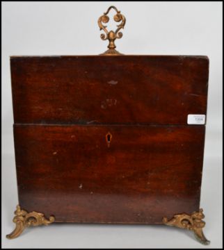 A 19th century large mahogany cellarette, fitted with  liner and sectional dividers, having a hinged top raised on shaped gilt metal ormulu legs and carry handle