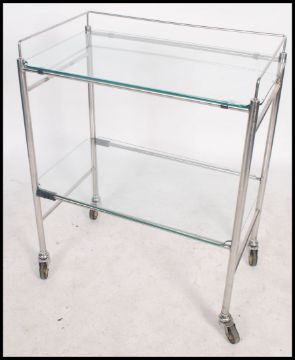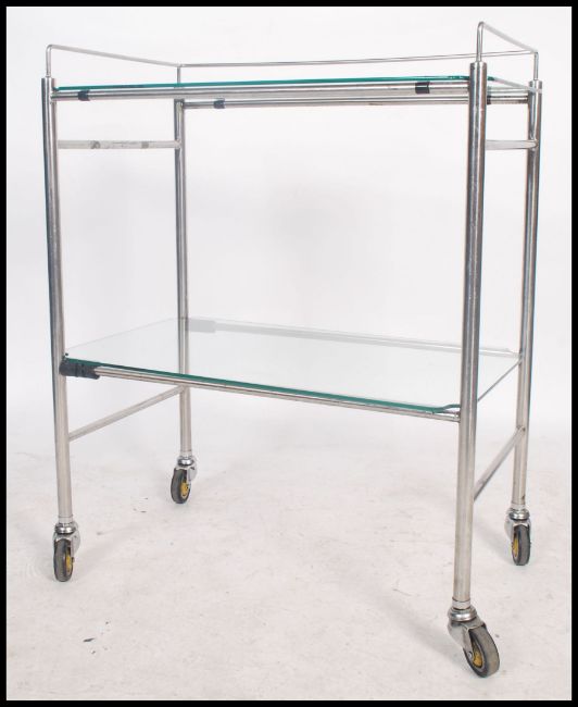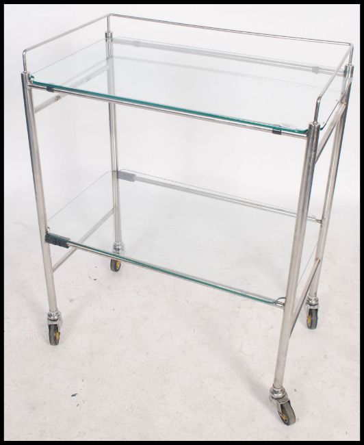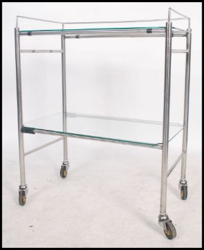 A good mid century Industrial surgeons theatre trolley of tubular metal construction with original castors and glass tiers. Believed to be manufactured by Chas F Thackray Ltd. Near Matching trolley in lot 1081