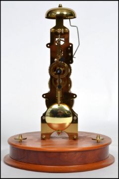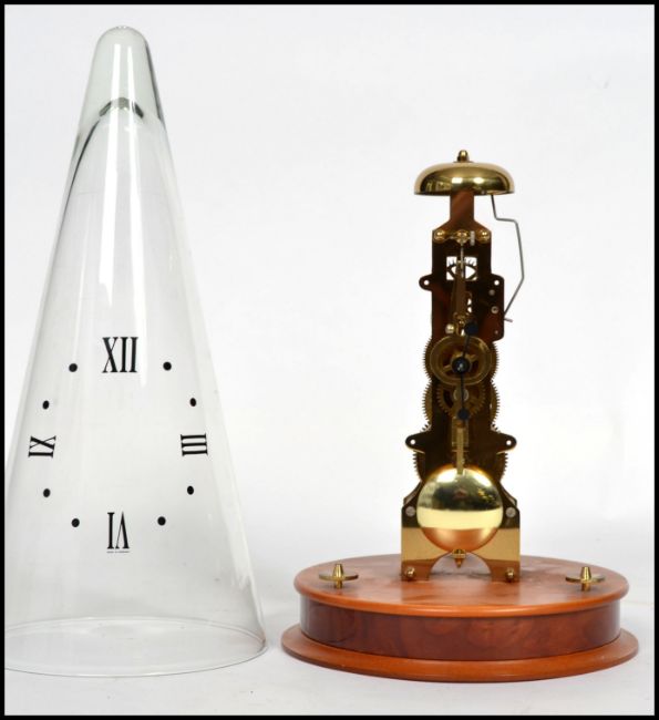 A Franz Hermle skeleton clock 791-081 having a pointed conical glass dome with painted numerals raised on a plinth base with bell and pendulum.